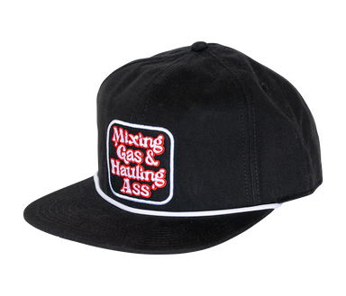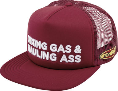 Embroidered Mixing Gas & Hauling Ass on front of hat, FMF patch logo on side