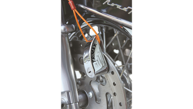 Alarmed disc lock with 7 mm pin alerts you to tampering Includes reminder cable, carry pouch, 2 keys, and batterie
