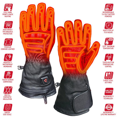Premium Aniline cowhide leather construction 150 grams of Thinsulate™ insulation Max Heat: 135° F @ 13W Each Power: 12V DC 1.1 Amp Each Keep hands...