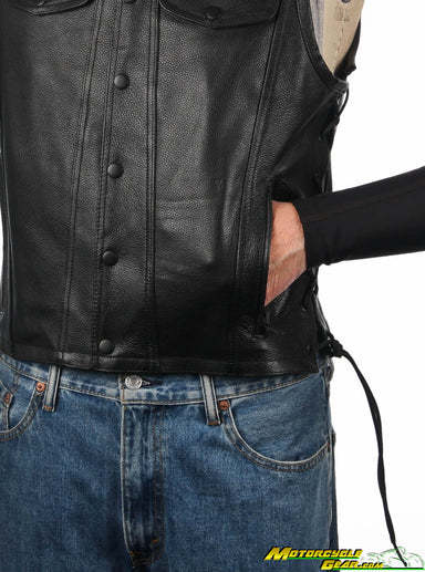 Genuine leather vest with adjustable side laces to give that classic "old school" look and feel. Vest has leather shell with fixed polyester linin...
