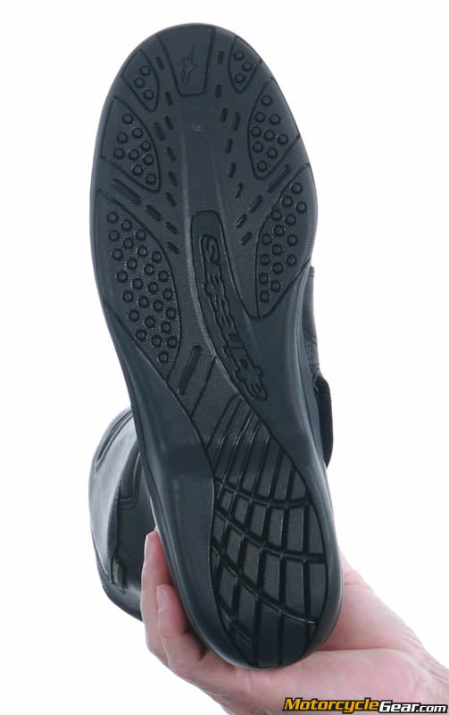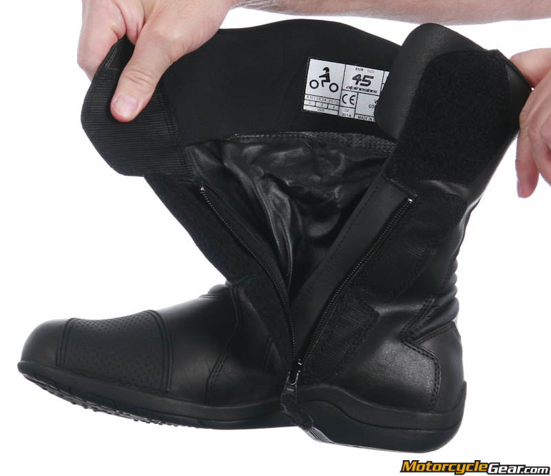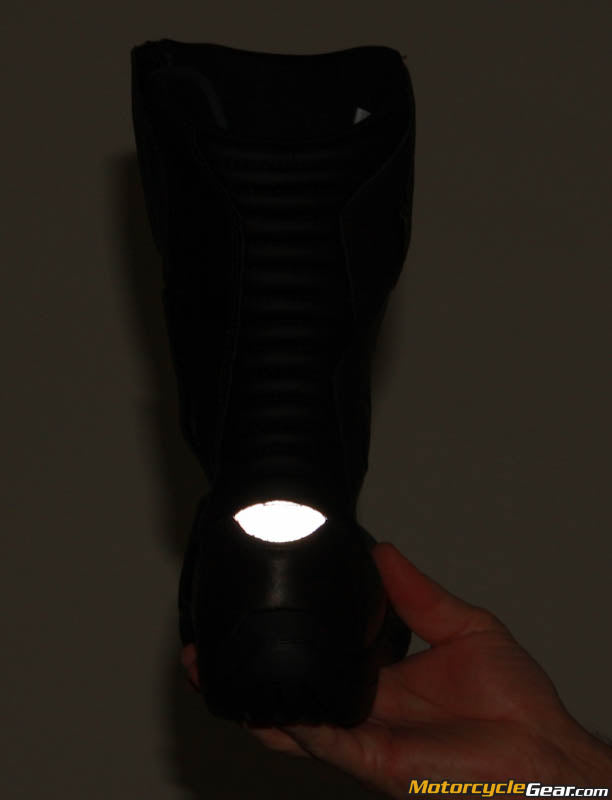 Overall, the finish and quality look excellent (as always with Alpinestars). I’m impressed with the feel of the shin, heel and toe reinforcements. Those, along with the thick leather, feel like they’d hold up very well long-term. The boots have some integral padding over the inside and outside ankle bones but I can’t feel any hard plastic armor pieces there. New for this year is the CE certification. The back of the boot has a bright reflective patch for nighttime visibility. You can take the “View Larger Pictures” link above to see closeups of this boot’s features.