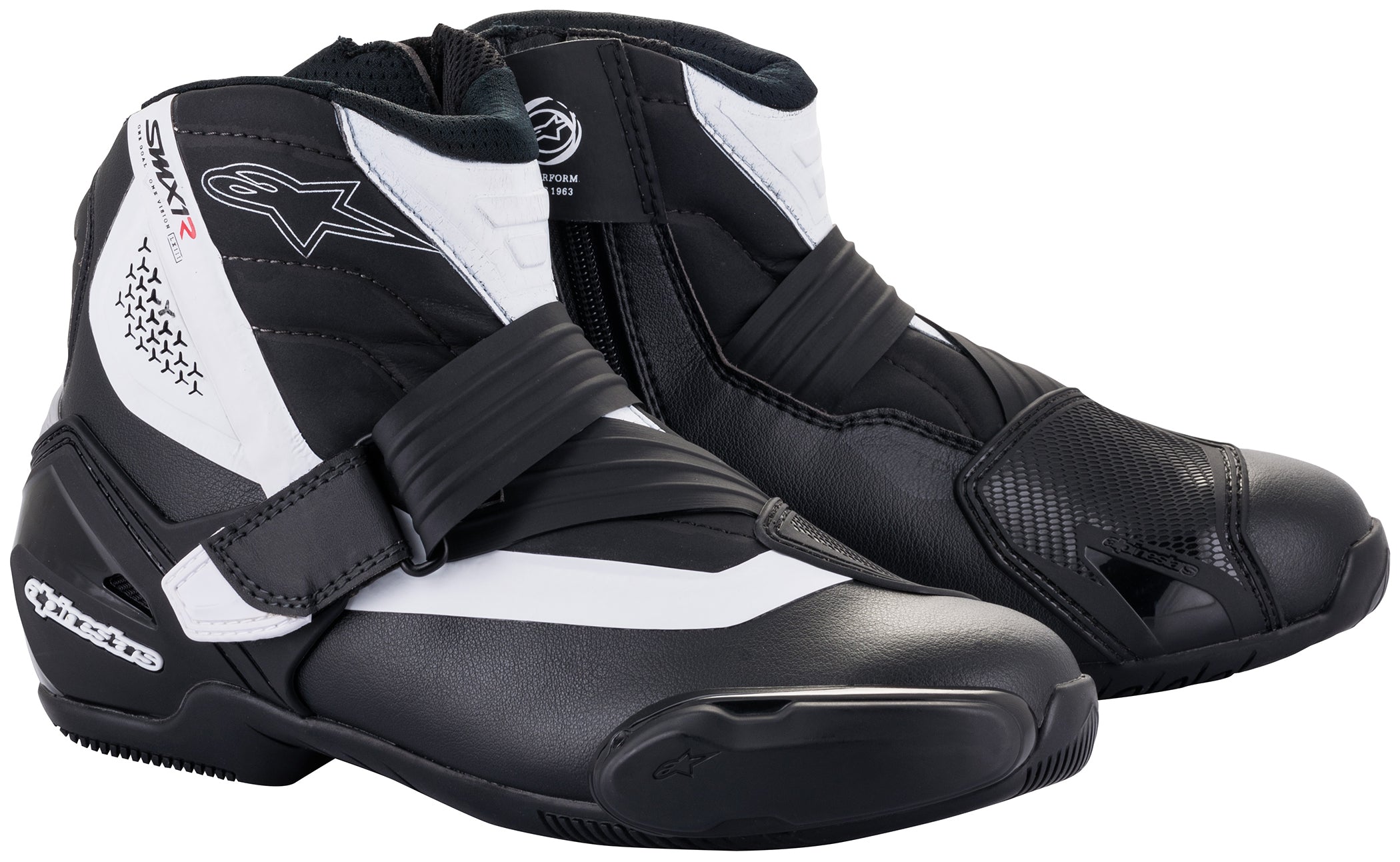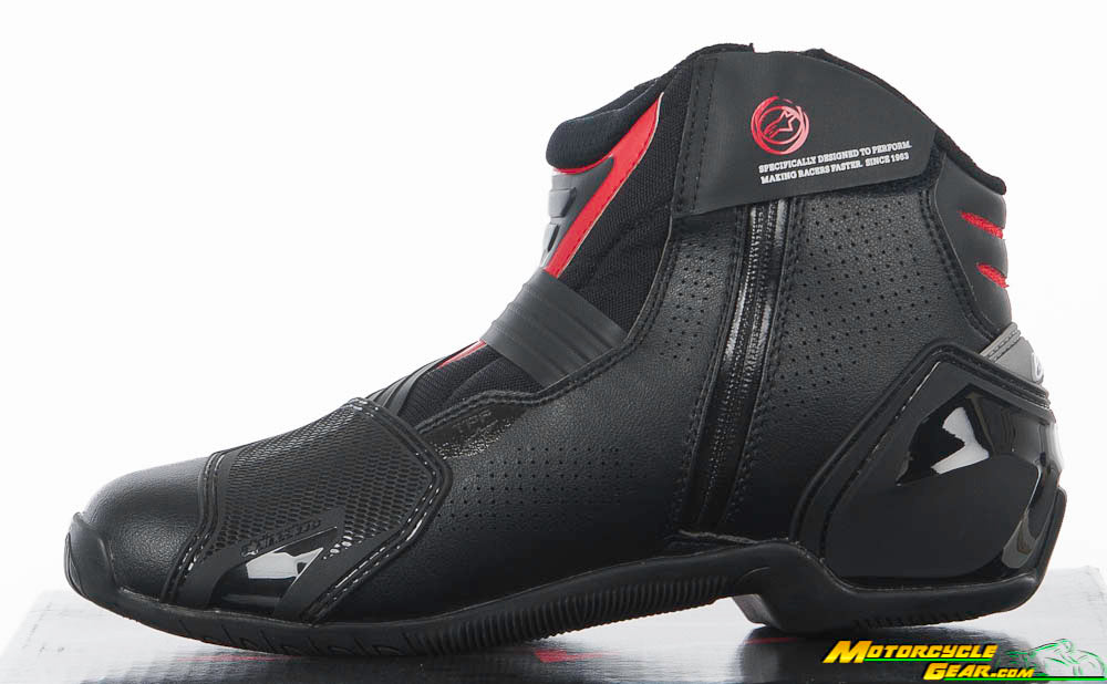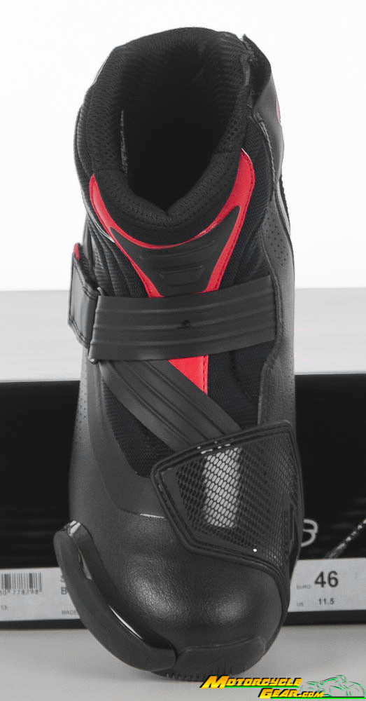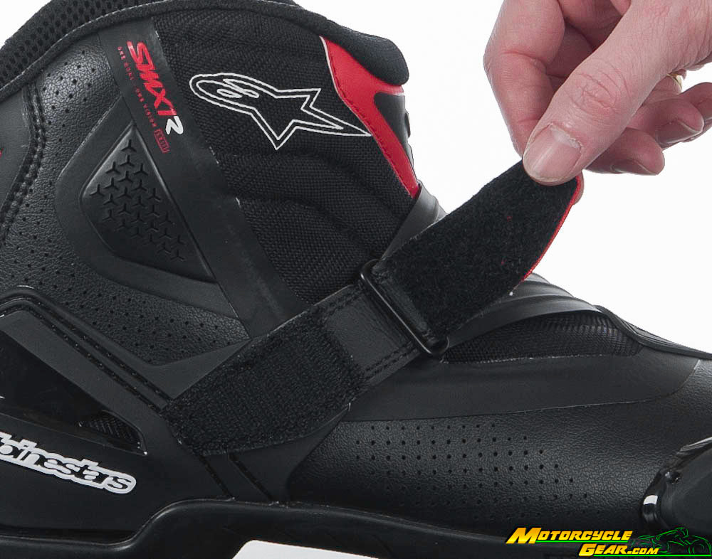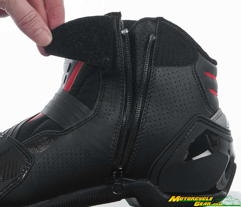 These boots have the protection you would expect from Alpinestars: toe box protection, a heel counter, ankle protection, and a stiffened sole. These shoes are very comfortable, just like most Alpinestars. The closure strap gives a pop of color for style and also allows you to adjust the fit of the boot across the instep. The medial (inside) zipper makes it easy to put the boots on in full gear.