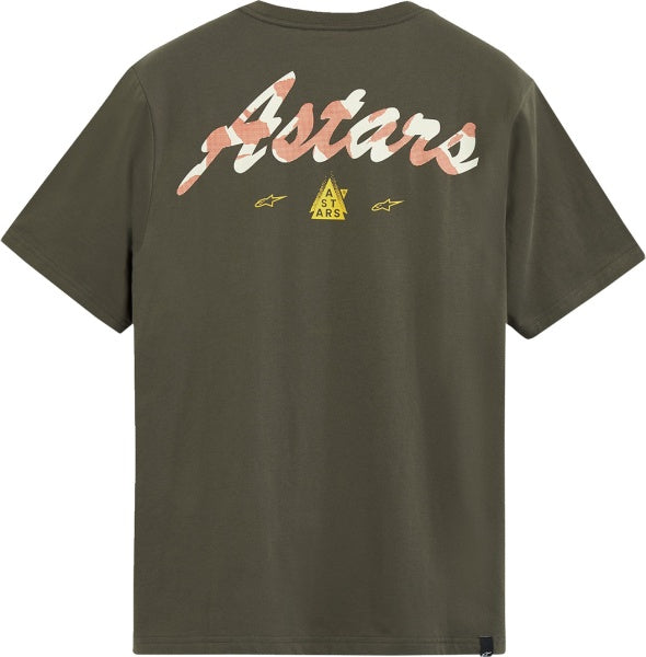 - Back Astars script and front icon graphics with pixelled camo fill. Soft hand print
