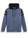 - Zip front hoodie with kangaroo pocket. Sleeve shoulder piecing and one-piece hood