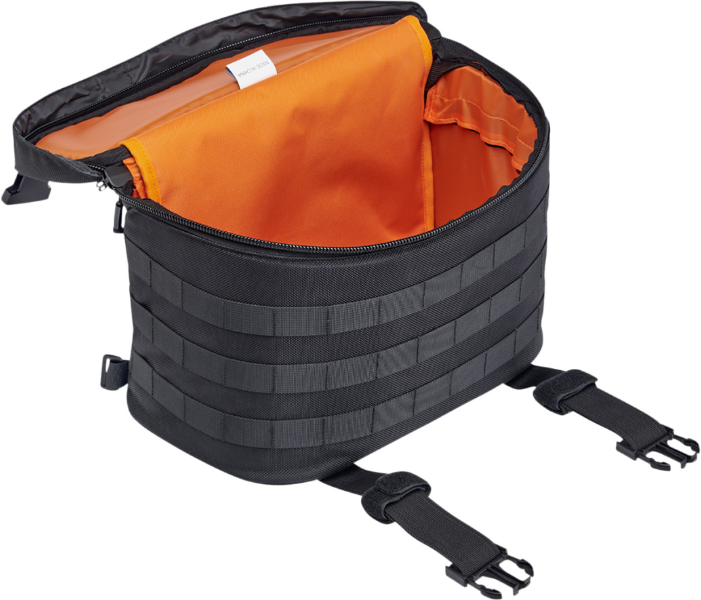 - Two-piece mounting yoke with adjustable hook and loop panel fastens to both bags with extra-large, heavy-duty nylon zippers