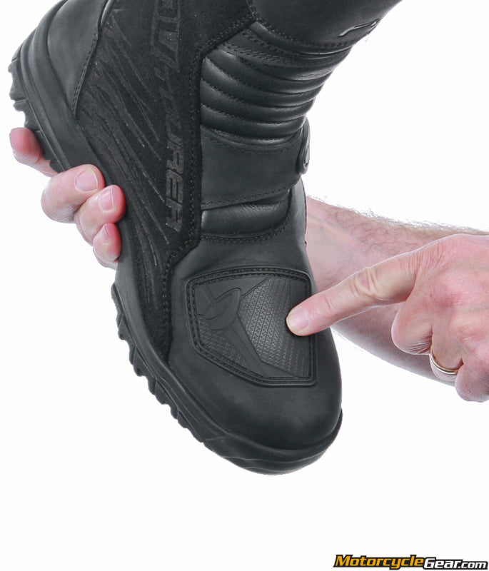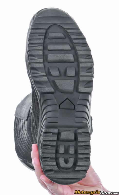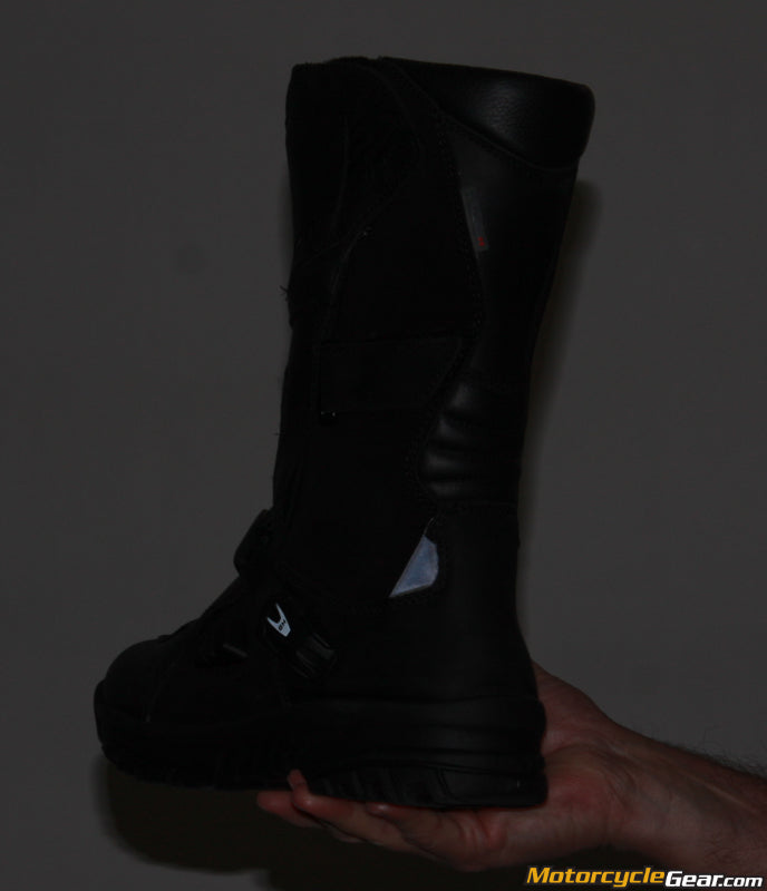 This ADV Touring boot design strikes a balance between the more “beefy” adventure riding boot (Forma, TCX, Alpinestars all make one) and a traditional. Every metric of this boot is “just a little bit less” than the Forma Adventure boot… the top is just a touch shorter, the closure is a bit less robust, with Velcro up top and one mechanical buckle as compared to three with the Adventure boot. The shin protection is a lighter duty setup with leather and a firm piece underneath rather than the big molded unit. The sole is about the same overall thickness, but the tread pattern is somewhere between the Adventure and more smooth typical touring boot (see our close up pictures for that). Both styles have an integral waterproof liner and both have substantial ankle protectors and reinforced heel and toe areas. With all the parts being just a bit lighter duty, this boot also is lighter overall which will be welcome for those who stay on road more, and who might spend more time off the bike and welcome the lesser weight and more flex.