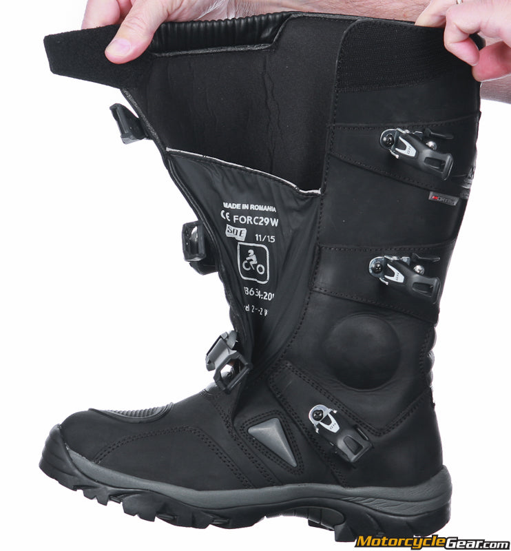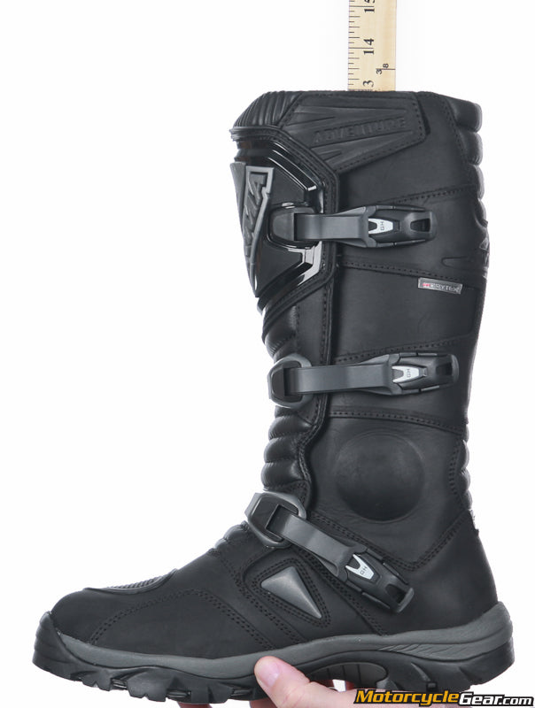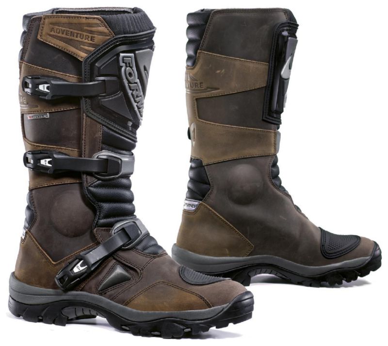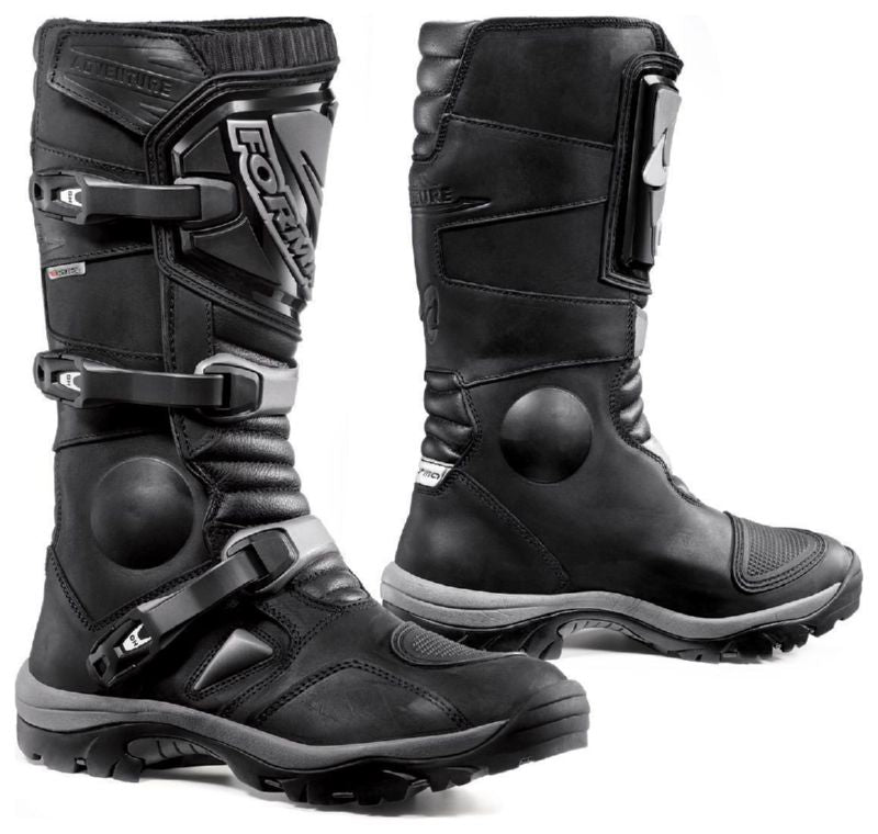 We are pleased to be offering Forma boots for the first time! I’m reviewing the Adventure and Adventure Low boots today. After looking over the boots and comparing them to our other selections, I think they compare very favorably. The pricing of these boots is very similar to others, but just about $10 to $20 less than comparable brands… not a lot less, but if there are things to like AND the cost is a bit less, then it can be a winner for you. Also, the sizing is a bit more wide (as mentioned above) than other brands. Just a touch wider than Alpinestars or TCX and significantly wider than Sidi, so having the Forma gives a good choice for those with a wider-than-average foot. The specs of these boots are similar to other adventure riding boots. They have a heavy duty molded sole with a beefy looking tread pattern and the sole has impressive stiffness as well as a steel shank, so they’ll hold up to standing on pegs. The leather used is STIFF as compared to most others. I wouldn’t say they are in the league of a full-on off road boot, and certainly the leather will break in and become more flexible, but they are certainly more stiff than any regular street riding boot and the stiffness will give you confidence in the boots’ ability to provide support and protection. The boots have solid protectors on each side of the ankle bone that is situated between the boot’s padded lining and the outside leather which will keep those from rubbing on you. Also, those are a bit “cup” shaped to fit over the ankle bone comfortably. The boots have the normal stiffening pieces in the toe area and also around the heel area so the boots will keep their shape and also protect against impact. The taller Adventure model has one more external plastic protector on the shin and one additional buckle, which, by the way, is the only noticeable difference between the Low version and the “regular” Adventure model. Both models of the Adventure are made waterproof by way of an internal waterproof and breathable liner. One thing that separates really nice boots like these from “entry level” boots is often the buckle system. The boots have a good buckle system. The parts have a sturdy “positive” feel and they adjust easily. And they appear to be anchored to the boot very well on the buckle end with steel screws. We’ve eliminated more than one boot model from our store’s offering due to cheapo buckles so I’m happy to see a good setup here. I’m really pleased to be offering these boots because I think they’ll be another great choice for lots of riders. They are offered with a one year warranty which is exercised directly with Forma USA. I’ve visited with the owner of Forma USA about this and a lot of subjects on their boots and he strikes me as being a dedicated and professional person who is excited about the product. You can get the “feel” for the company from their FB page, and I think you’ll agree they present as a genuine and quality oriented company without much marketing hype, which to me is refreshing. :: Paul, 10-20-16