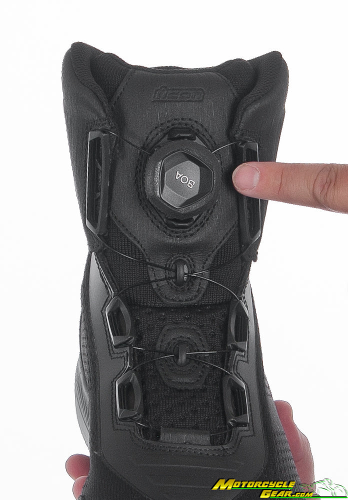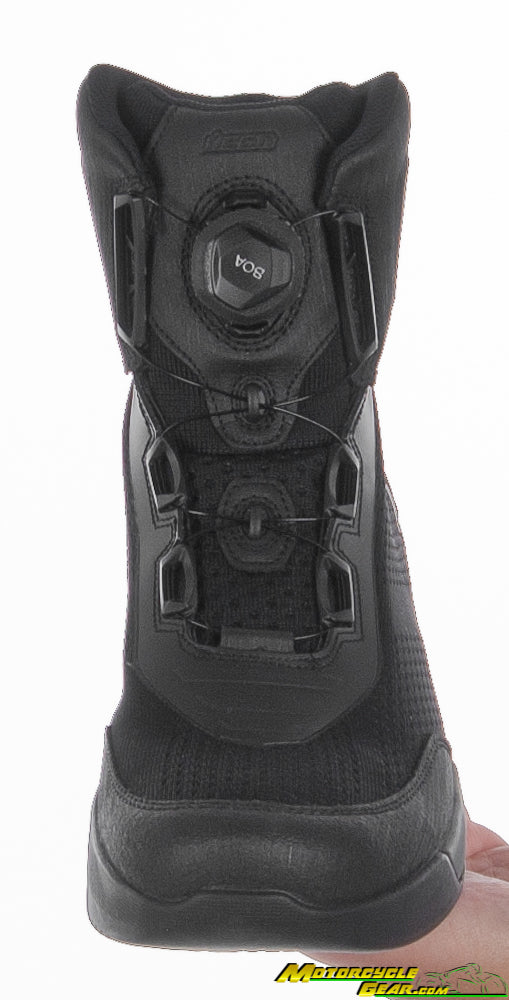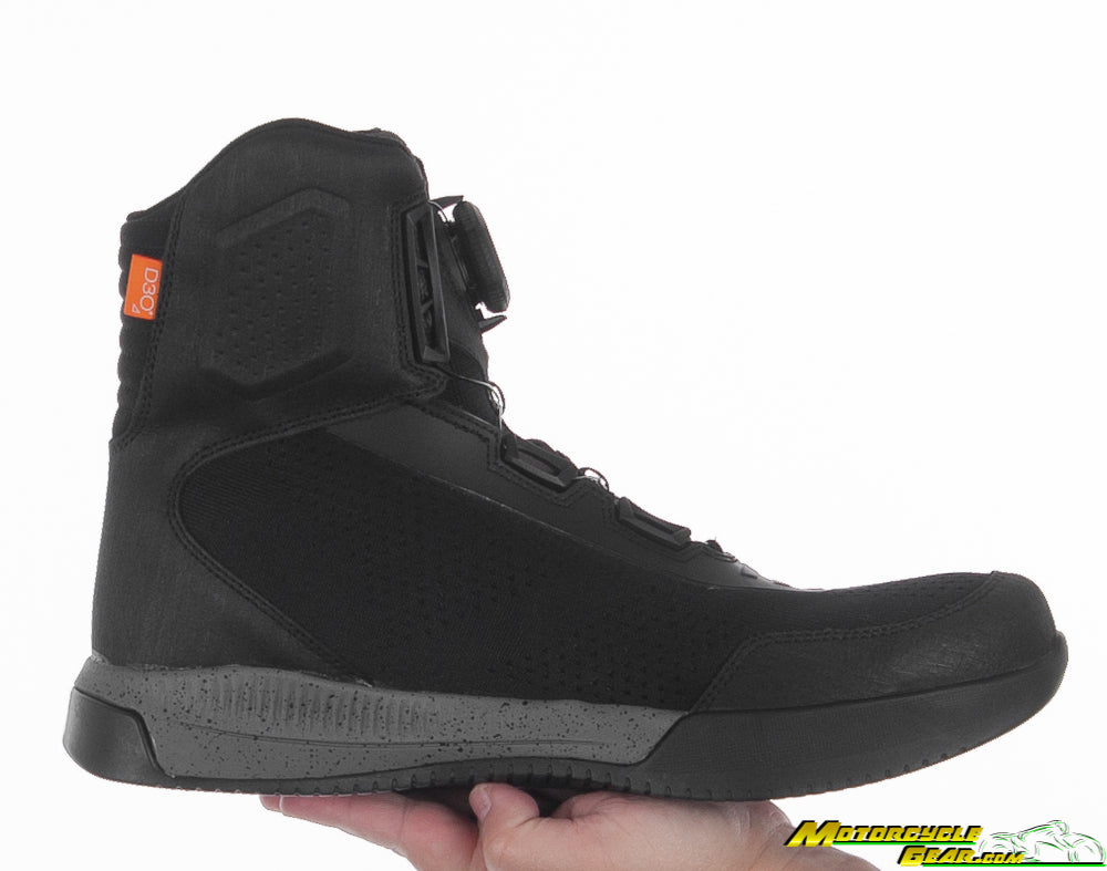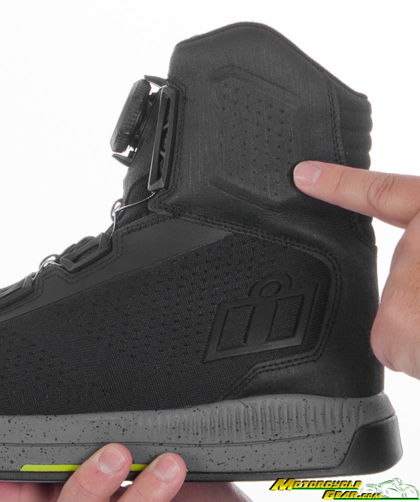 Welcome to the future of hot weather footwear from ICON. The ventilated textile upper with TechTuff overlays provides airflow and durability when the temperatures are on the rise. The BOA closure makes for easy on/off, while internal D3O ankle inserts provide increased coverage. Hi-rebound foam midsole enhances rider comfort, while a reinforced midfoot shank provides additional structure. Finally, the premium rubber outsole increases oil & slip resistance in wet road conditions.
