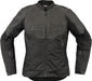 Below is the standard size chart from Icon for the fit of their women’s jackets. We measured the size large to check the chart and it measures out correctly. On the Large sample, the bust is 39”, the waist is 34” and the hip is 39”. Also we used the size large for some feature photos on our standard size mannequin Shirley (the size she normally wears) so you can click through and have a look at how that fits.