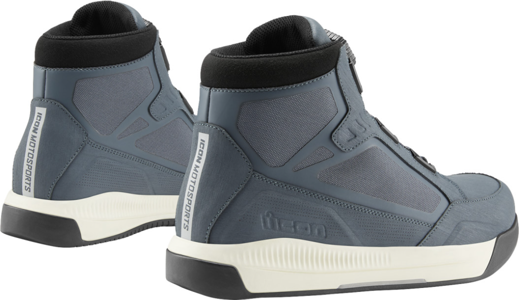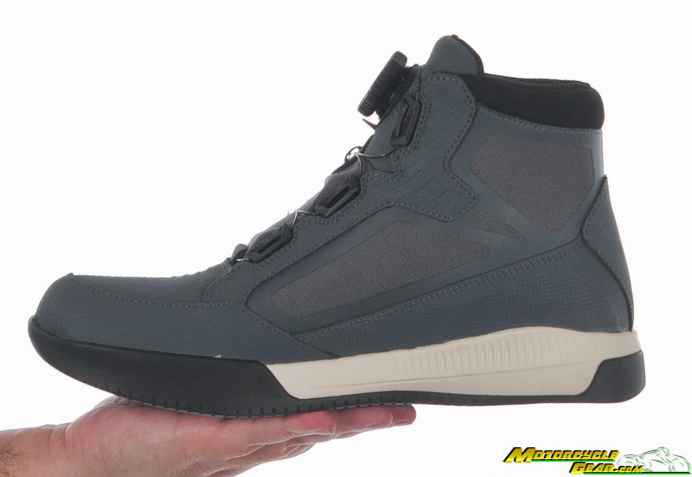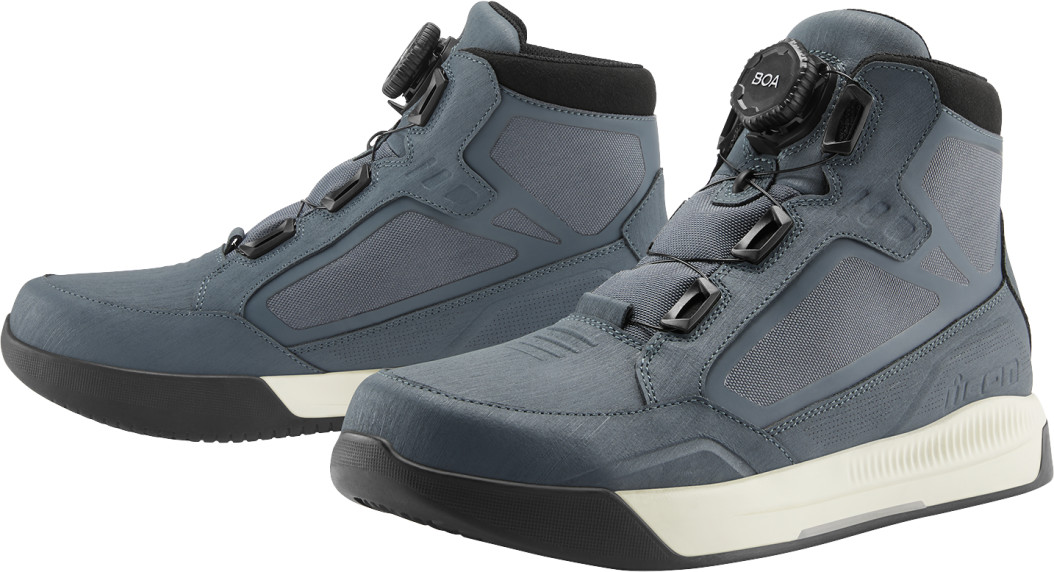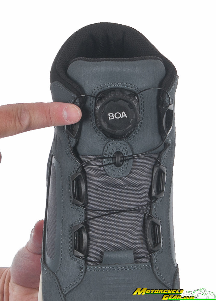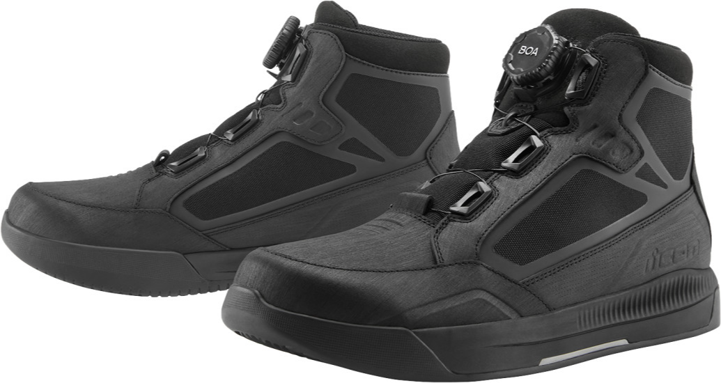 My impression was that this boot is a “D” or medium width and the length is generally true to the stated size. This style has a less boxy toe than usually seen in Icon boots. The boot has a BOA® lacing system, pop the dial out to release, push in to lock and then twist to tighten.