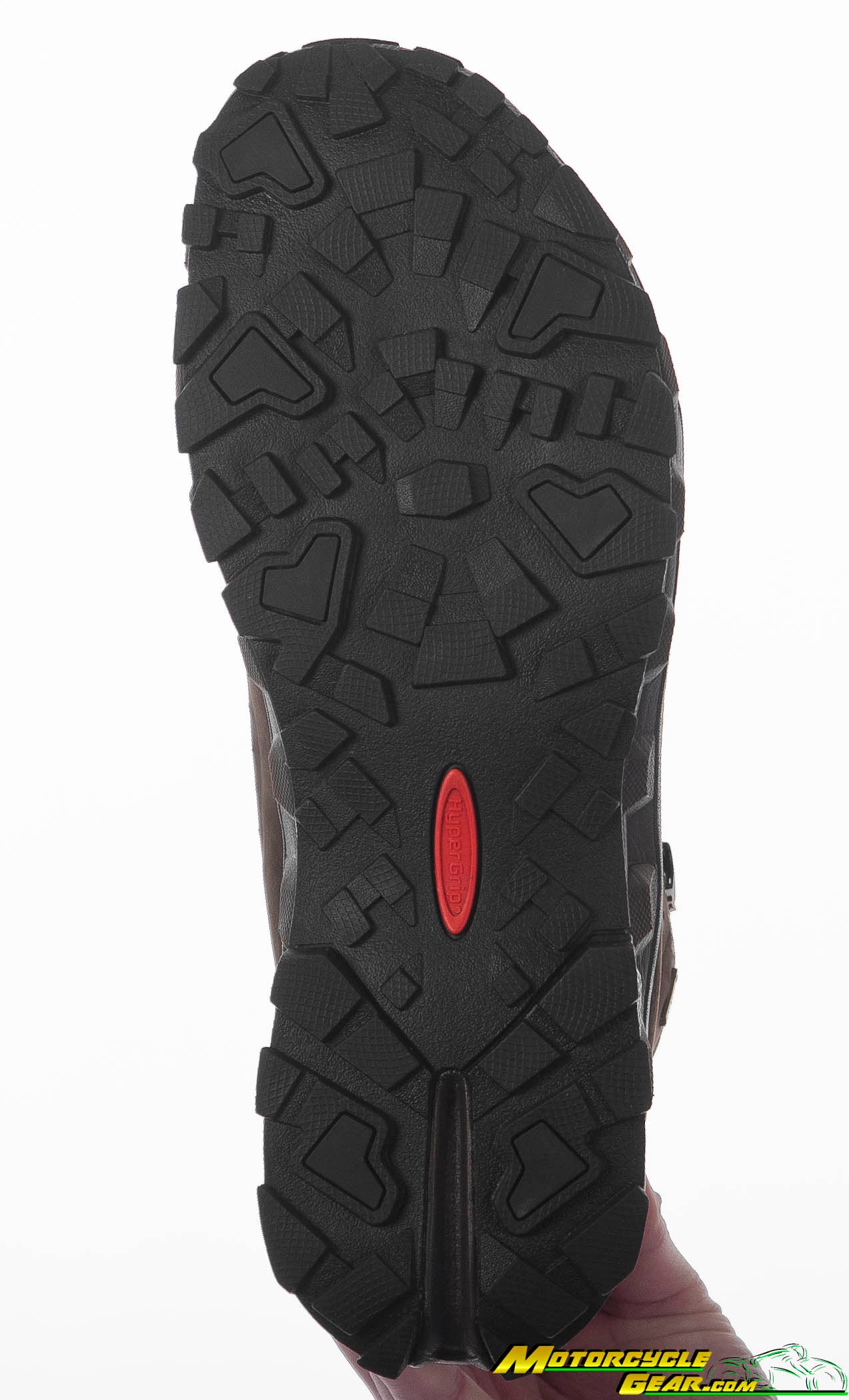 The sole design is much like other ATV style boots… the tread is aggressive and there is significant stiffness in the sole to hold up to adventure style riding where the rider often puts their body weight on the pegs. They won’t “fold up” like regular shoes or boots.
