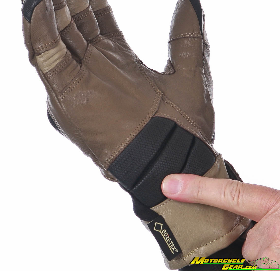 This is a solid leather construction glove (without venting), and it is also made waterproof with Gore Tex’s premium Gore Grip technology. The Gore Tex waterproof liner is fused to the back side of the leather rather than being a separate layer in the glove. That means the glove is less bulky and also has a better feel and “grip” because there isn’t an additional layer to slip and slide between your hand and the controls (hence the “grip” in the name). Being solid leather gloves without insulation, the best temps for use will be moderate.