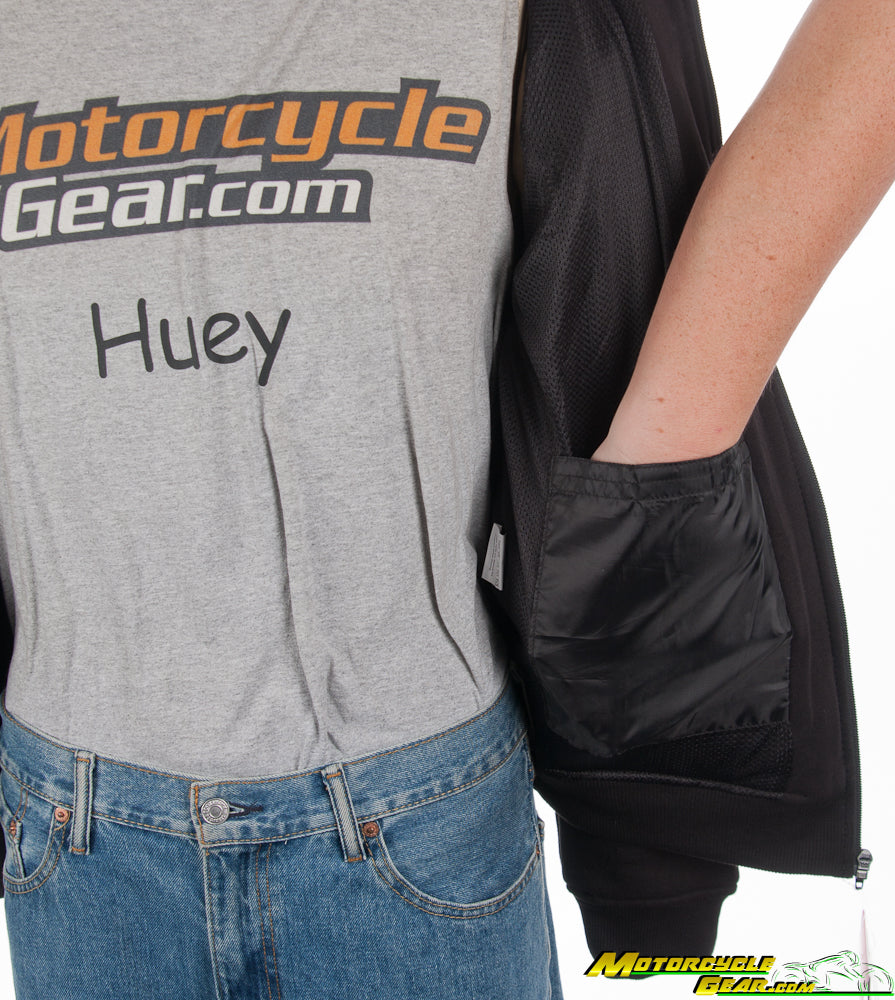 CE level 1 armor is included in the elbows and shoulders and there is a pocket for an optional back protector if you wanted to upgrade (see related products below). The impact areas around the armor are reinforced with 40% Aramid with 60% polyester. Just remember that all that reinforcement is attached to non-reinforced cloth so it won’t do too much good in a slide.