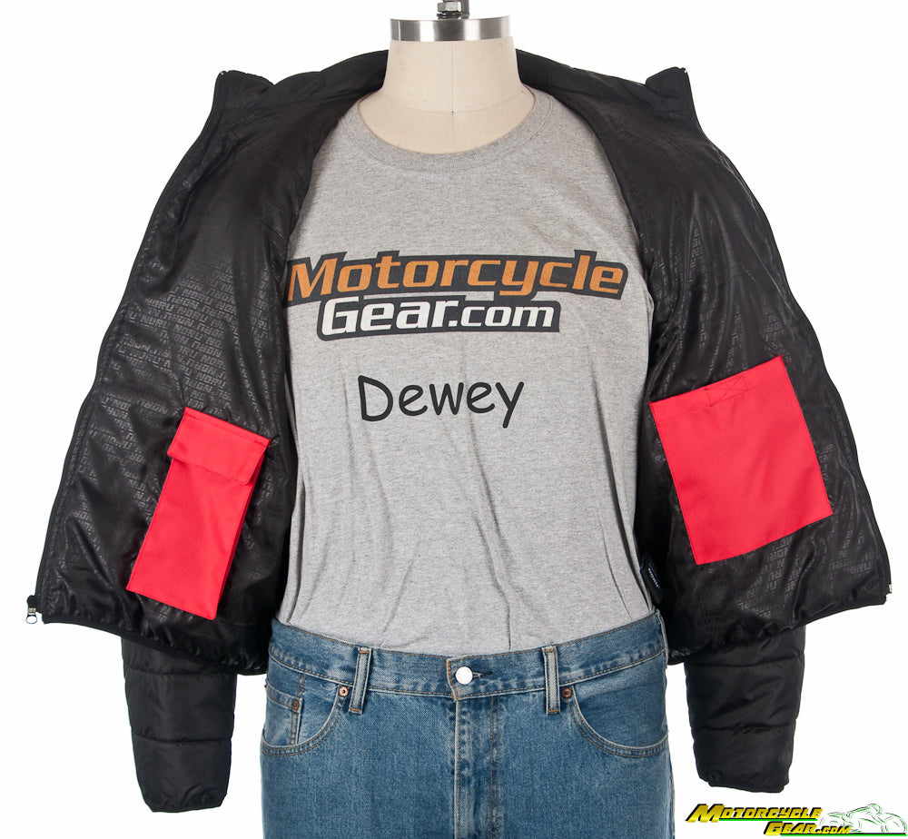 We checked the sizing of this style with our Fit Check mannequins Huey and Dewey. They are wearing size Medium and XL jackets respectively. These are their “usual” sizes and they work just fine. We also checked the chest and belly of the other sizes and find them to fit OK too. Therefore, we recommend you choose the size you normally wear in men’s clothing. if you are between sizes, choosing down is probably the best move. The overall fit of this jacket is similar to other US brands, which is to say, roomy through the torso with a relaxed fit. The overall height and sleeve length I’d say is “average” and is very similar to Tour Master products. If you are slim and tall, you may not fit a good fit here, but average or stout built people will probably be happy with the overall cut. You can also choose a size by measuring your chest and belly and using the chart (below) which lists max chest and max belly sizes for each jacket size. The measurements in the chart are a combination of the manufacturer’s size chart and also the measurements we take on the product samples. After you measure, you can choose a jacket size using the chart. You’ll want to choose a size that will accommodate both your chest and belly.