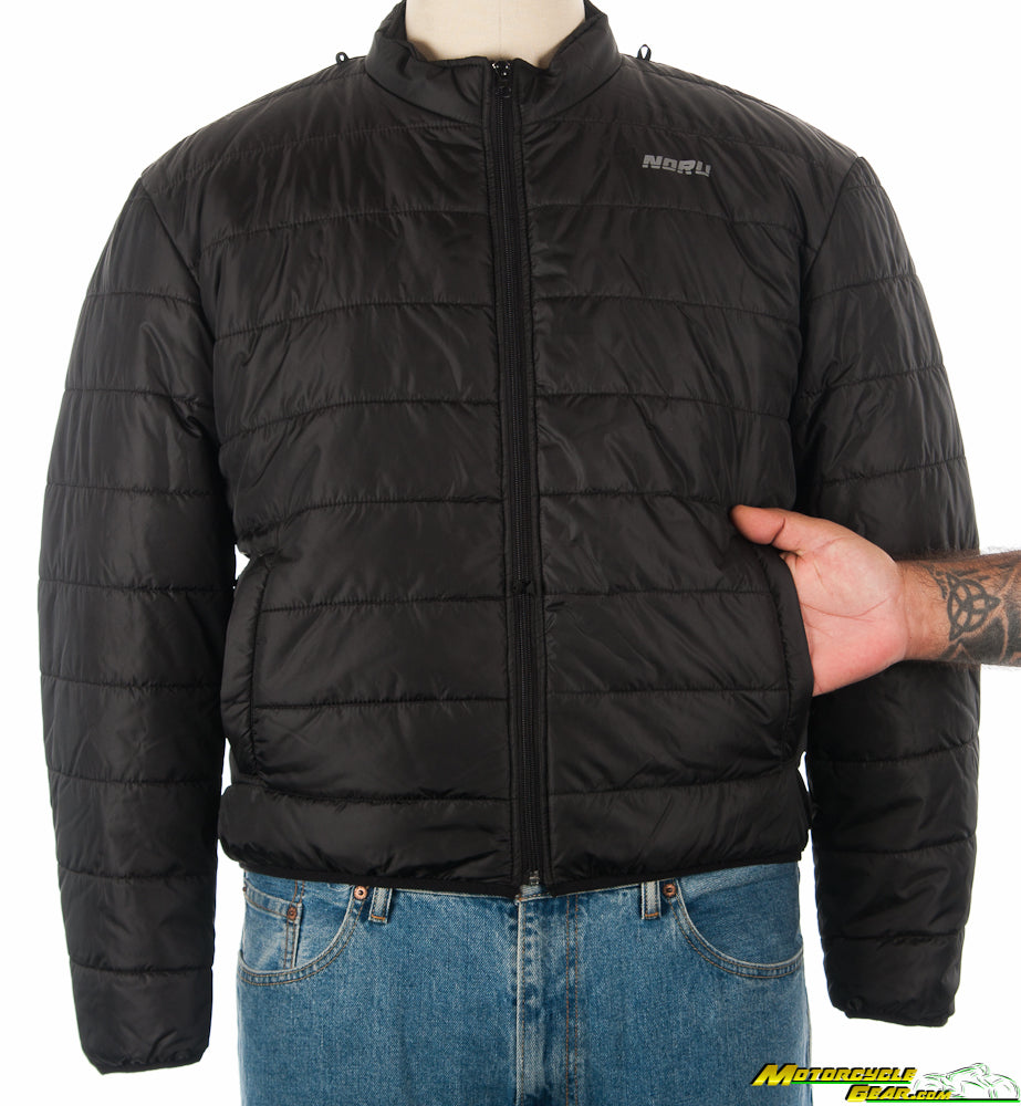 Noru designed some of their new line to work with this Adventure Jacket liner, some of the jackets have snaps on the interior that attach to this liner through hoops at the shoulders, cuffs, and near the midsection. In the stock photos, you can see these hoops on the shoulders but they are almost impossible to see if you aren’t looking for them in person. This liner has a phone pocket on the right side of the interior and a hook and loop on the left. The exterior has two hand warmer pockets.