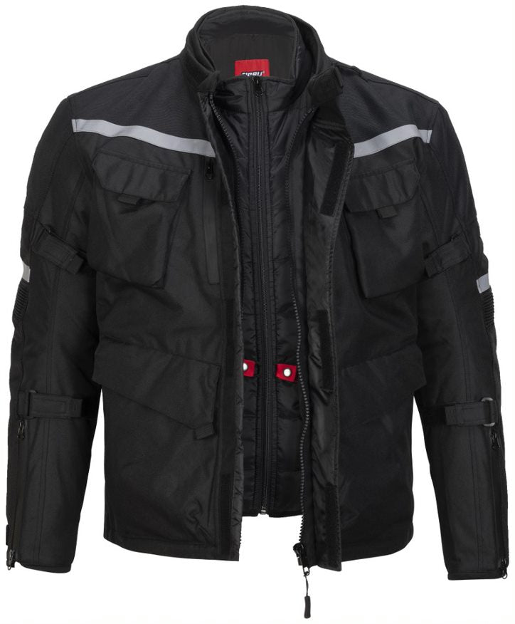The overall fit of this jacket is similar to other US brands, which is to say, roomy through the torso with a relaxed fit. The overall height and sleeve length I’d say is “average” and is very similar to Tour Master products. If you are slim and tall, you may not fit a good fit here, but average or stout built people will probably be happy with the overall cut. A longer jacket like this is typically cut “boxy” but they have large side torso adjusters so even if you are slim through the belly you can get a good fit.