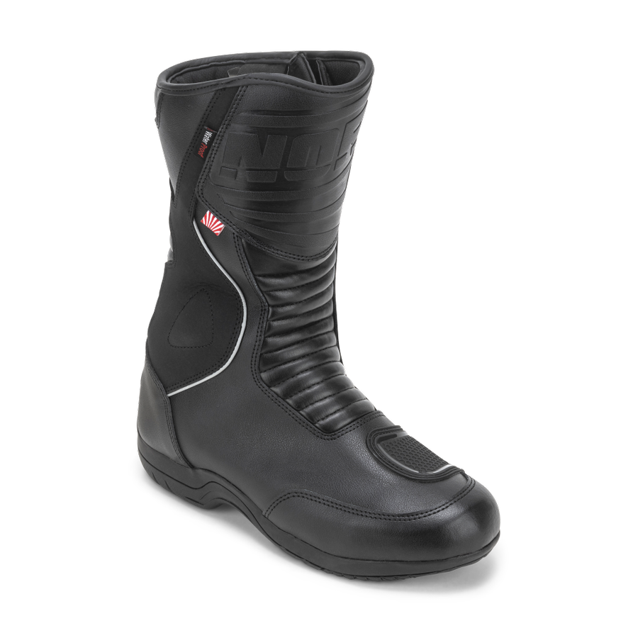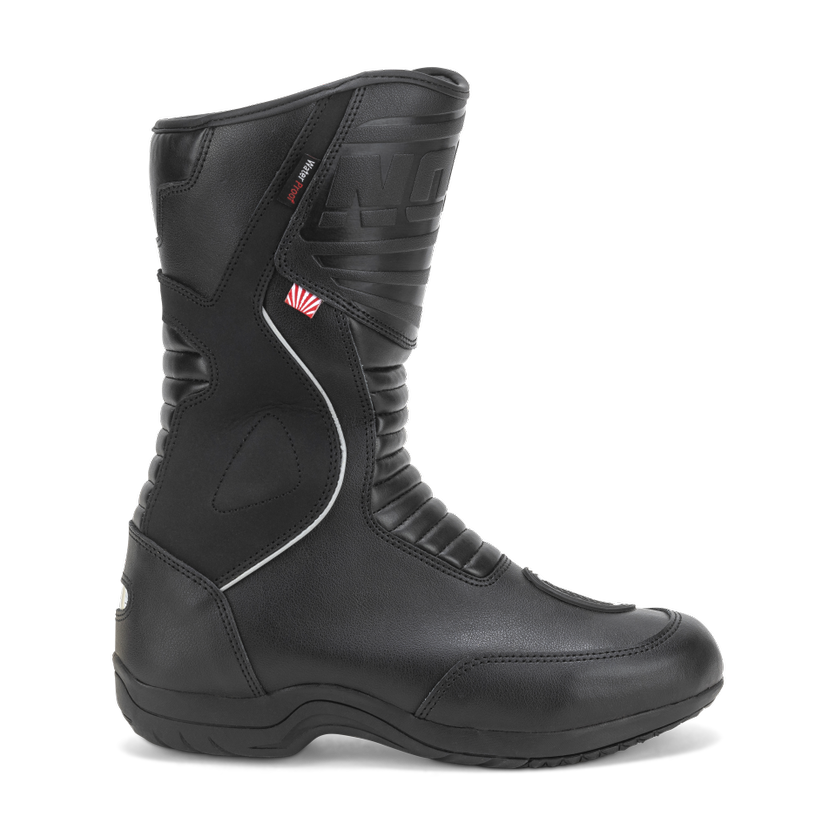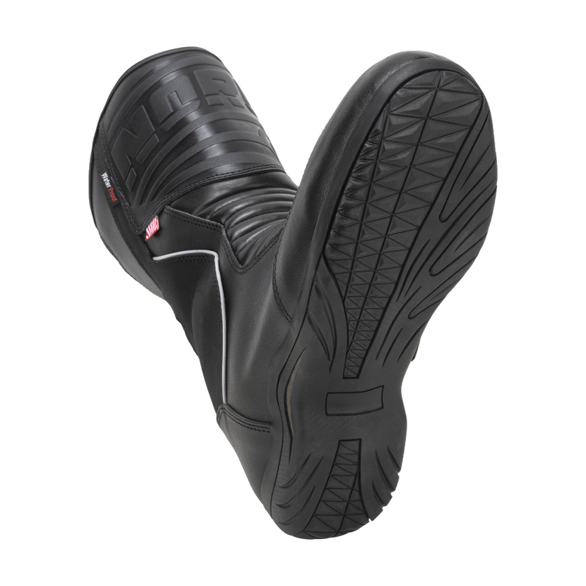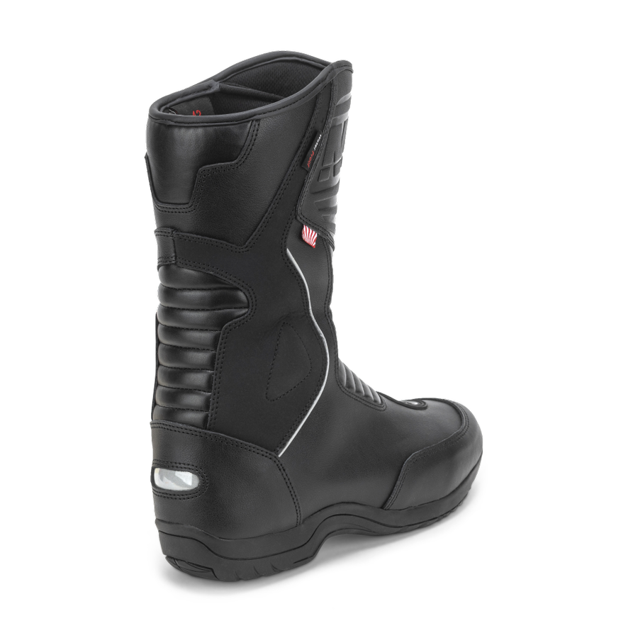 These boots are waterproof and have a gaiter along the side zip to keep the water out. There is armor in the ankles and both the toe and heel are reinforced. The shank seems to cover to just about the toe box as well. A rubber shift pad and rear reflective accents round out the safety features.