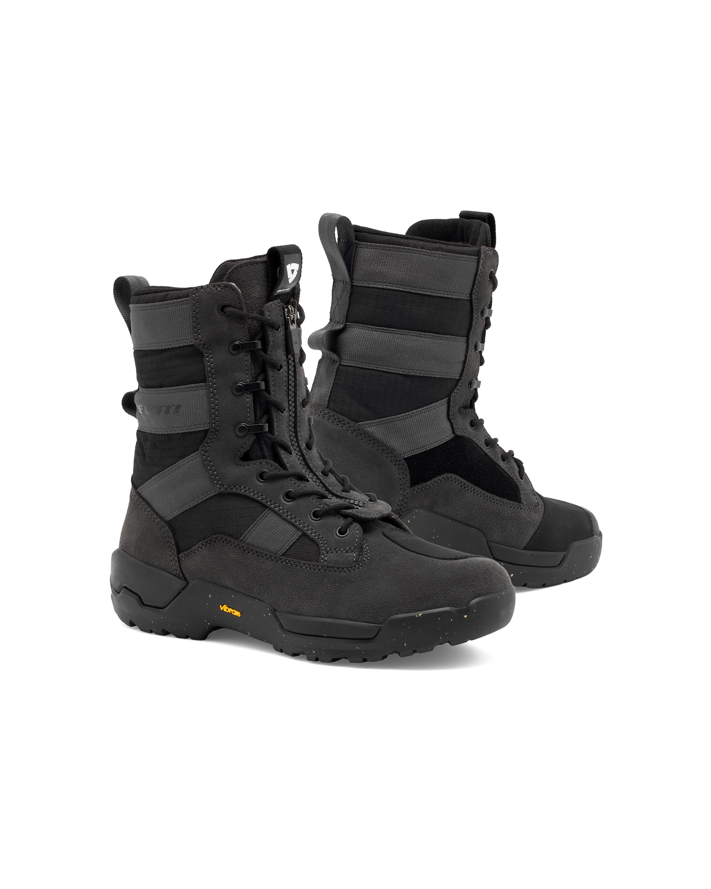 Moving to the front there is a TPU gear shift pad, it will be symmetrical on both boots, and the primary closure system is going to be laces. Cool thing about the laces is that they are fairly robust, feature metal eyelets and hooks and underneath the REV’IT! logo they have a nice pull tab that actually unbuttons and can be utilized as a way to keep the tied shoelaces in place.