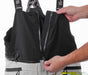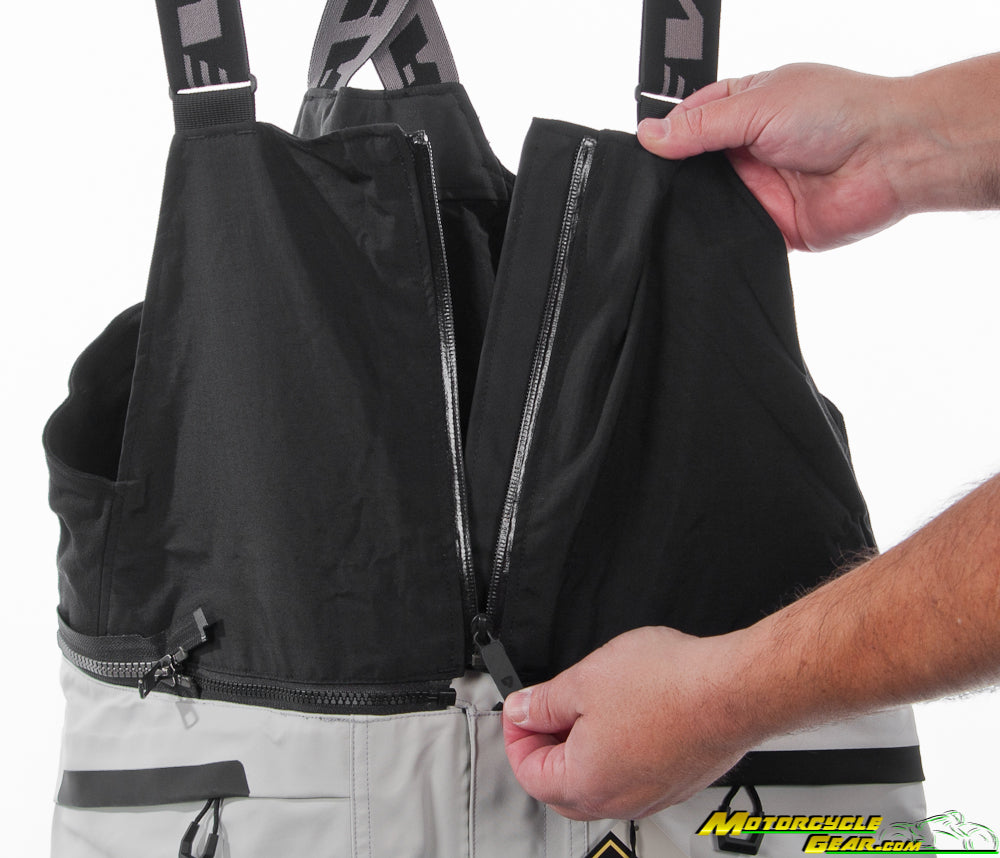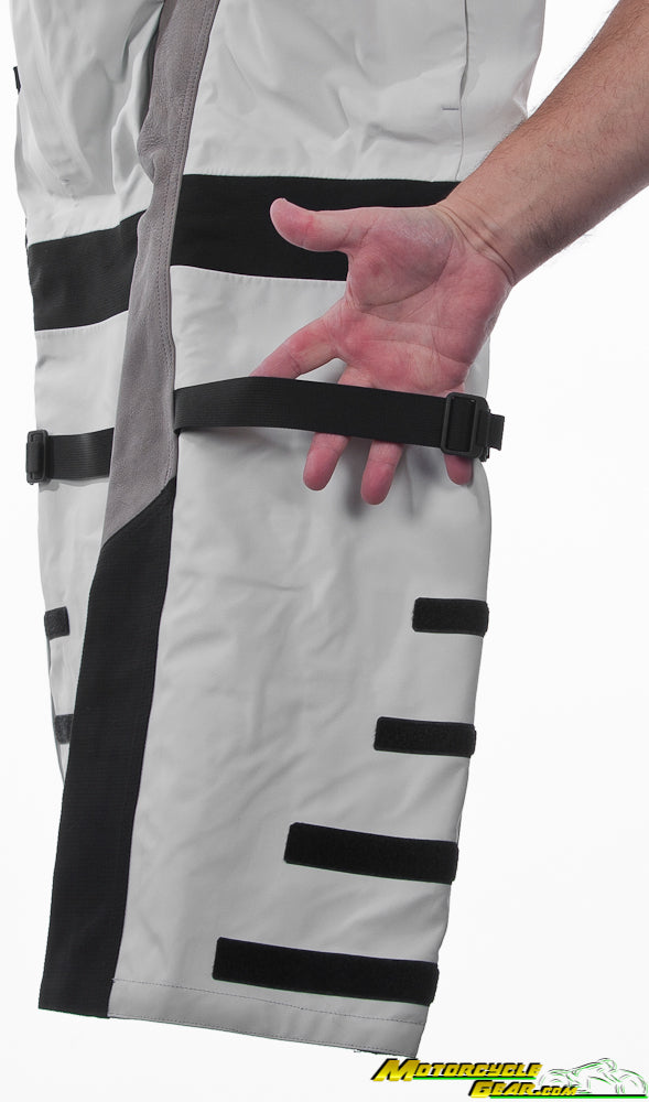 The pants are highly adjustable with adjustments at the waist, knee, and hook and loop adjustment at the cuff. The knee armor also has 2 adjustable heights thanks to hook and loop stops at the bottom of the pocket. There are leather panels at the inner thighs to guard against exhaust heat and help grip the tank while improving the lifetime of the garment. There are also included suspenders attached via a zip on waterproof gaiter that is fully removable. The waist features both long and short connection zippers that include the mating half so you can pair these pants with just about anything with the help of a tailor.