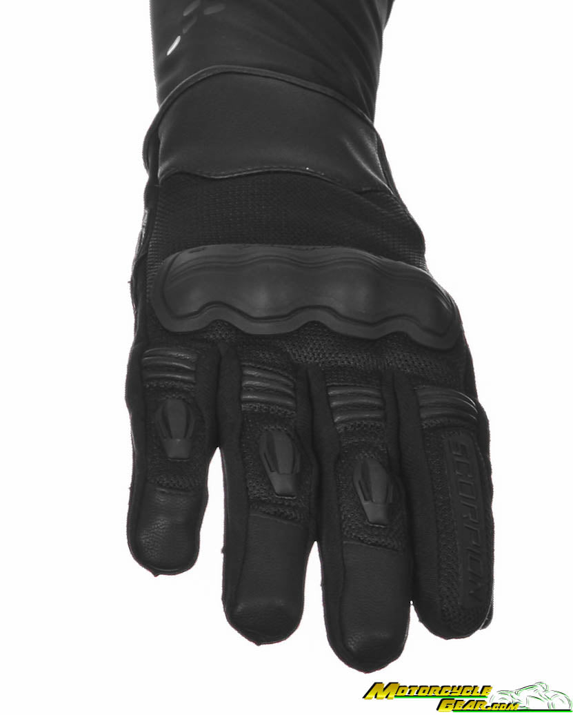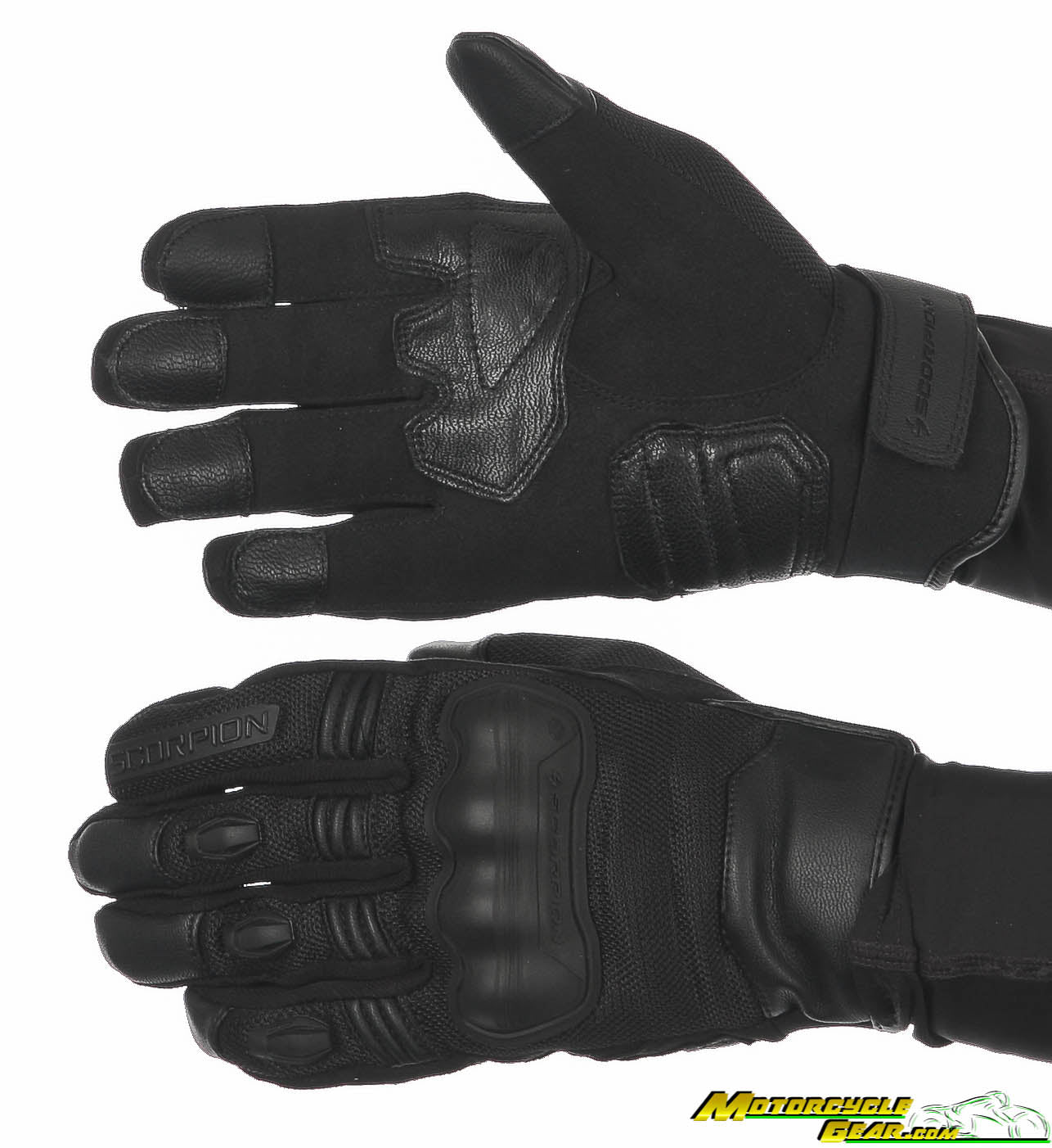 Scorpion says: The Divergent Gloves from Scorpion combine a goatskin reinforced, double stitched and padded palm with synthetic leather reinforced fingertips and thumb for abrasion resistance and durability. The knuckles have 3D molded armor while the index finger and thumb are touchscreen ready.