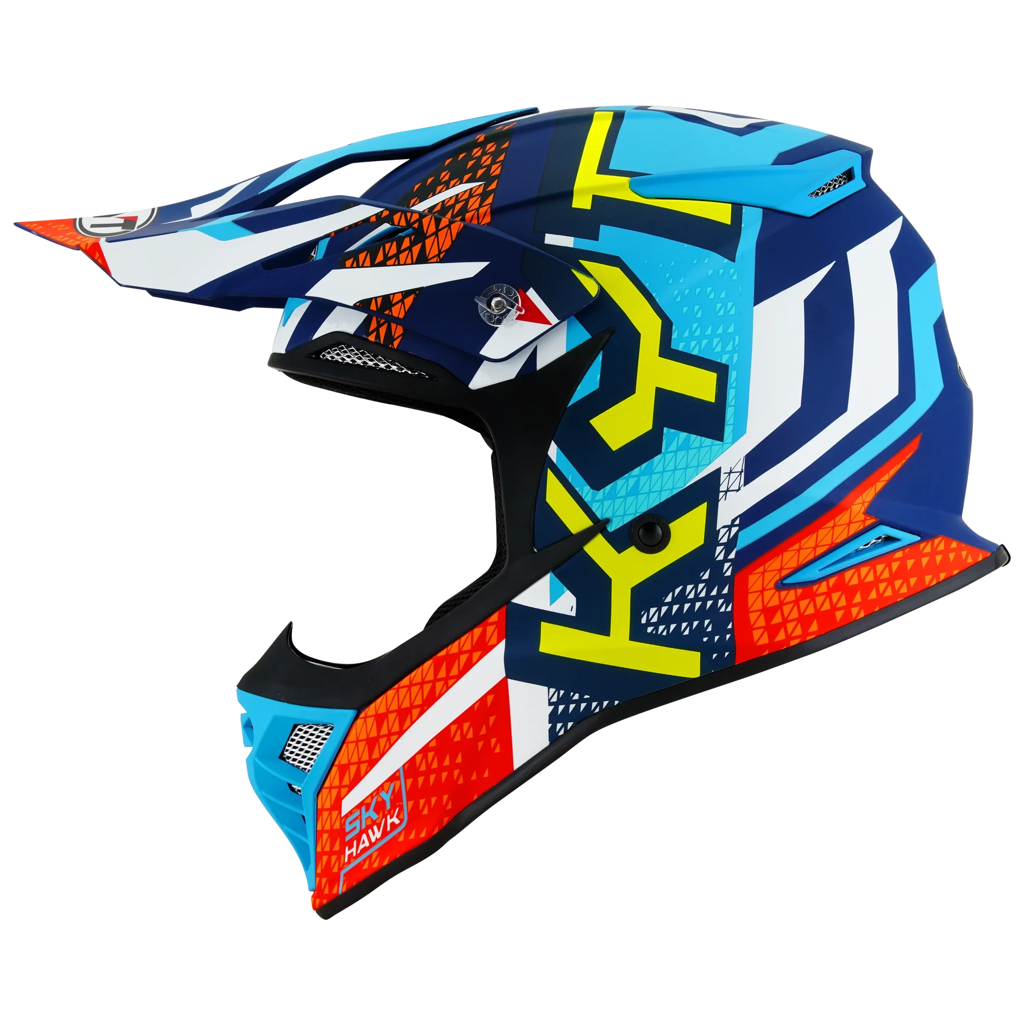 Skyhawk is the latest generation off road Helmet by KYT, made of TRI-fiber composite, dynamic and performing shapes. It’s developed and optimized in the most famous tracks of MX World championship. The performances have been raised to the highest level to satisfy the needs of the most demanding rider and motorcyclist. Protection, ergonomics, weight and ventilation are the result of extensive studies and tests on track with the best riders.