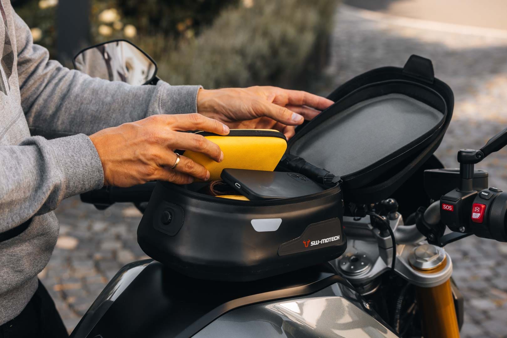 - Ensure that there is sufficient space between the tank bag and the surface of the tank (also when fully loaded) to avoid damage to the paintwork. If there isn't enough room between the two, the surface of the tank can also be protected by a protective film or a tank pad.